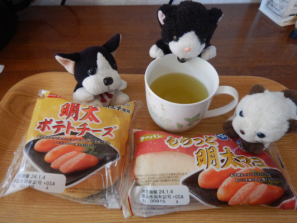 2024年1月の新商品。第一パンの「明太ポテトチーズ」と「もちっと明太マヨ」と、日本茶。