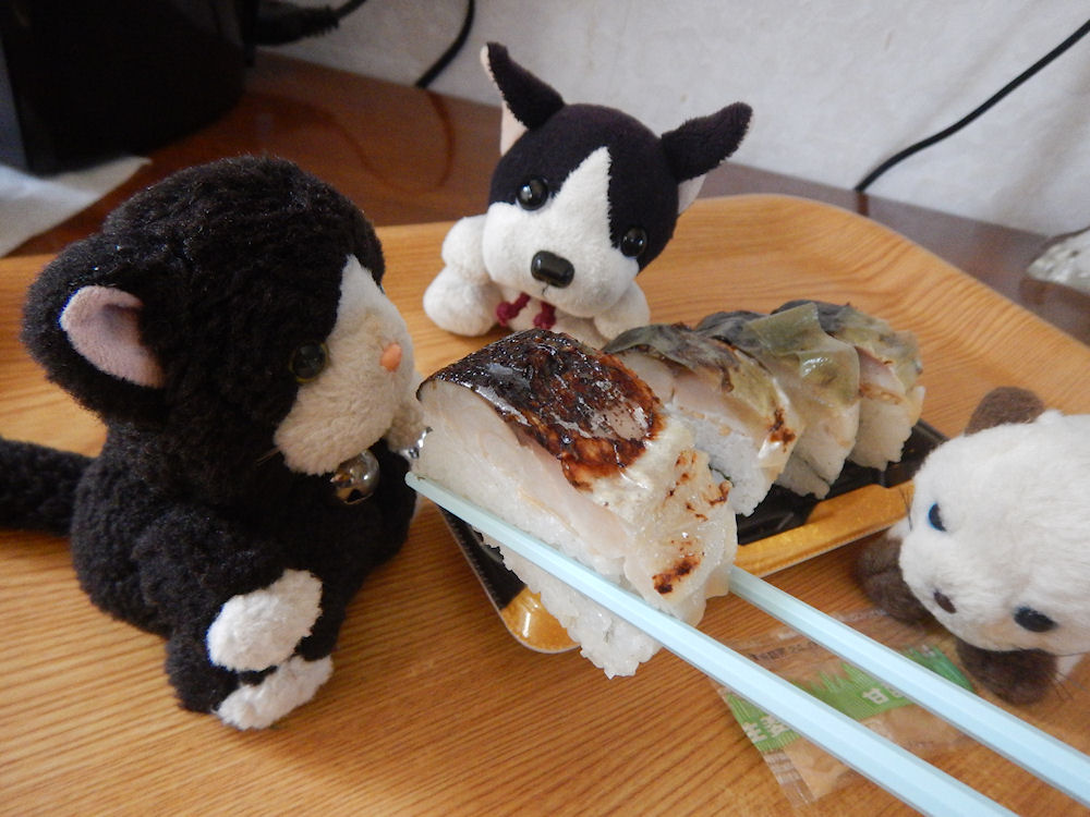 3月8日は「さばの日」だから、昼食はスーパーで買ってきた「炙りサバ押寿司(4貫)」。焦げ目がついた、美味しそうな、さばがのっているサバ寿司が税込343円。
