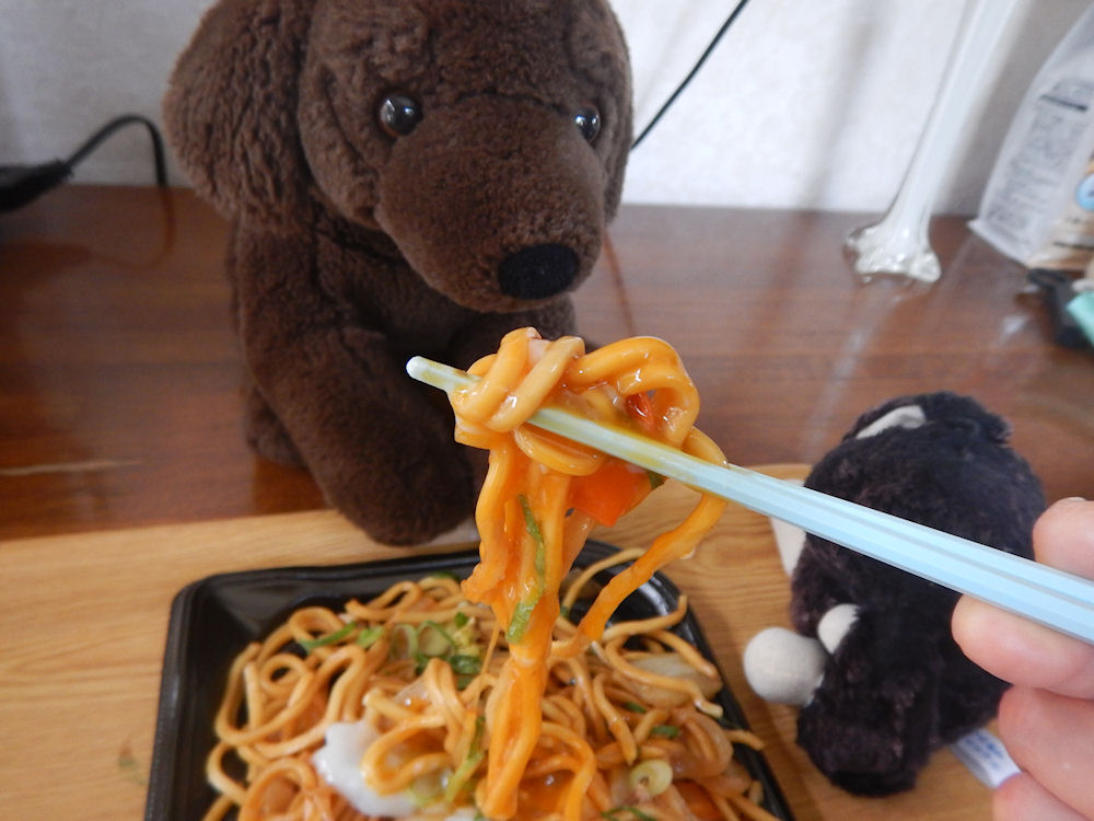 食べてみると。太麺の、そばは、甘口で、ネギやニンジン、キャベツ、玉ねぎなどのサクサクが美味しいです。