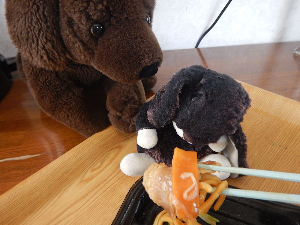 うさぎに、牛肉を食べられてしまった、犬でした。