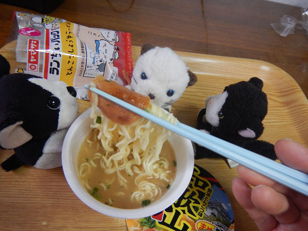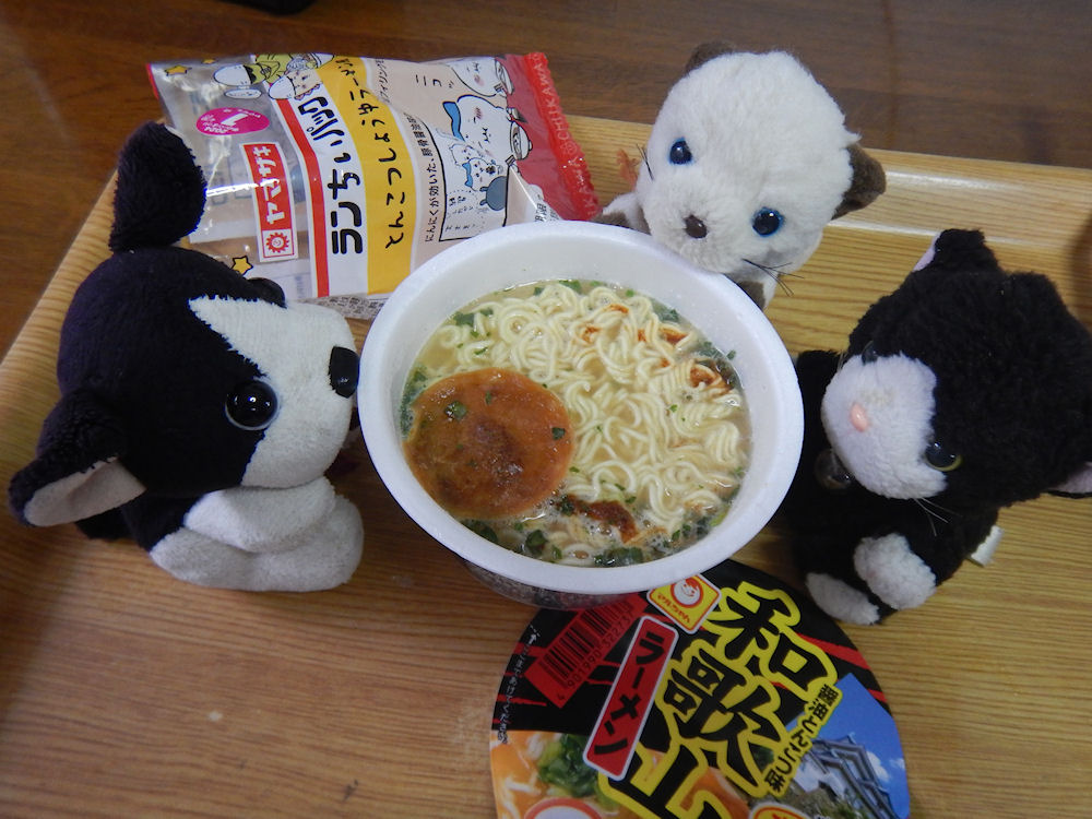 みんなで豚骨醤油ラーメンを食べようと集まった、ちびくろ、こねこ、シェリーの3匹。ちいかわと、ランチパックのコラボ「ランちいパック」の豚骨醤油ラーメンを食べた、ちびくろ。まだ、物足りないようで、シェリーが持って来たカップラーメンを狙っています。
