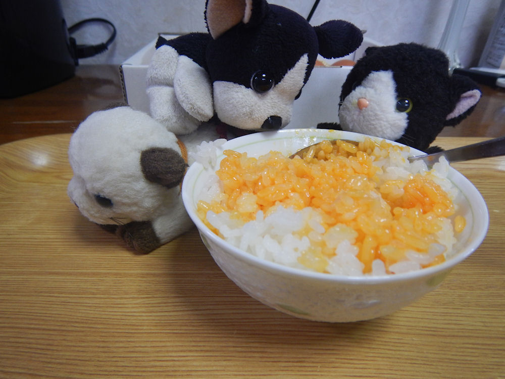 シェリーが食べたそうに見ている、卵かけご飯。卵かけご飯は、ご飯を白身と黄身で食べるのですが、今回は、黄身のみで食べました。