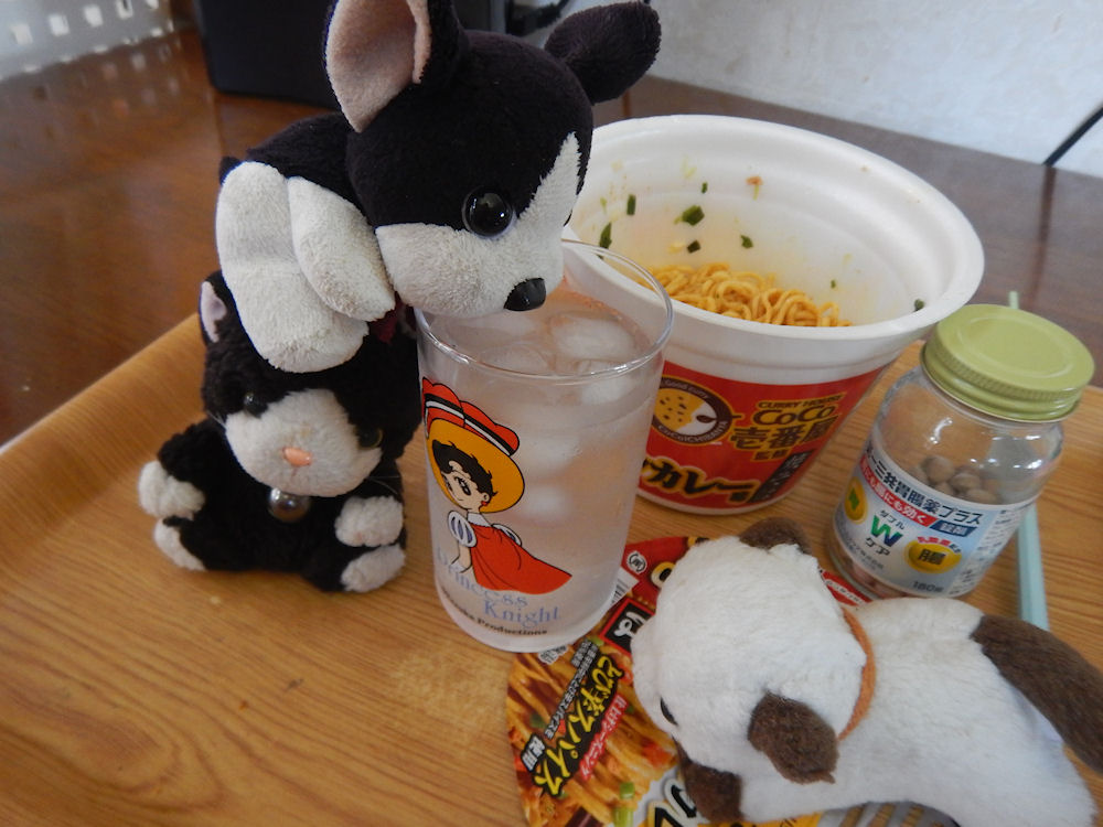 用意した、水を飲みながら食べる、ちびくろ。でも、唇と喉がヒリヒリして辛い。
