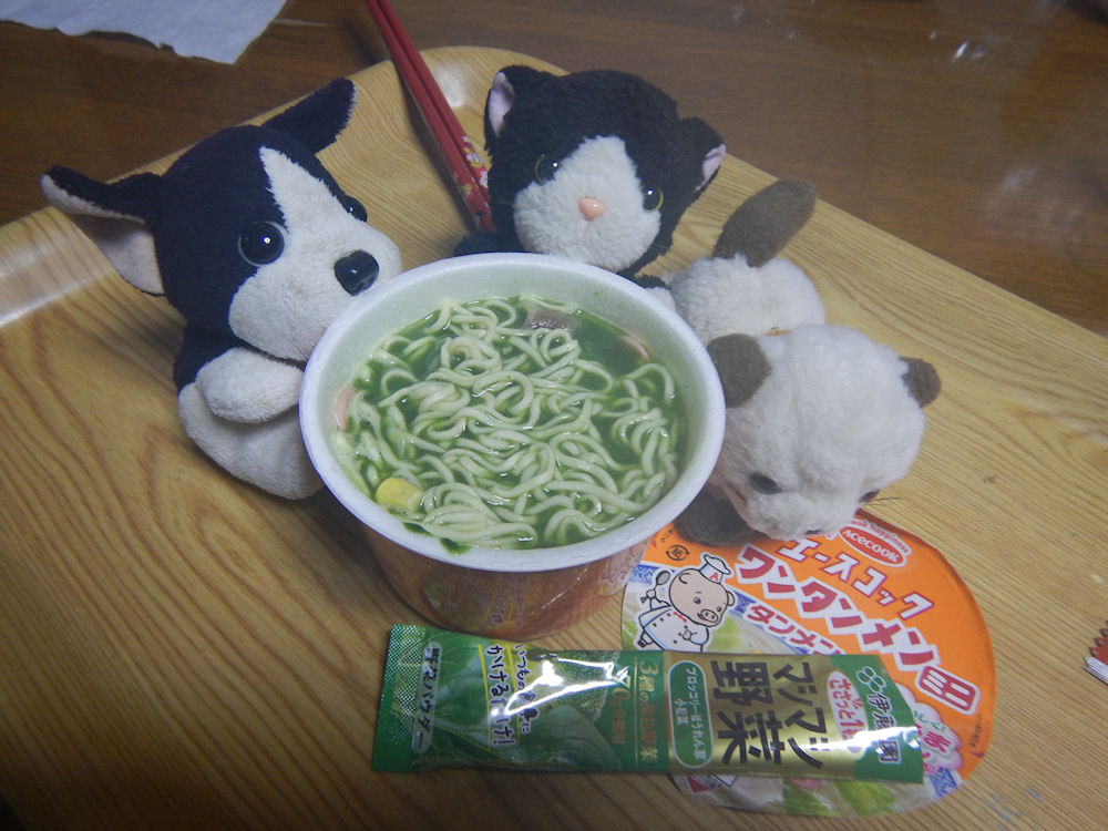 伊藤園の「マシマシ野菜」は、野菜不足を食事と一緒に補えるというもの。これを出来上がったワンタンメンに混ぜると、緑のワンタンメンが出来上がり。